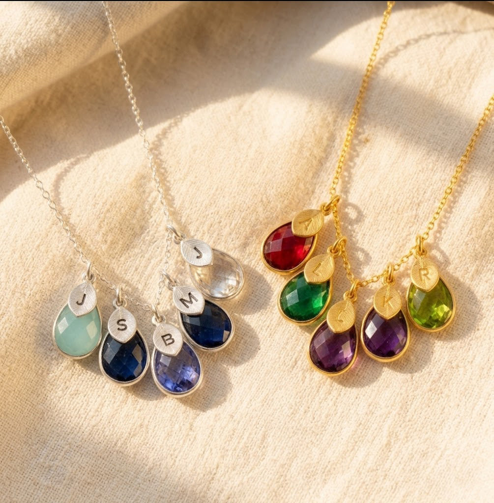 A perfect gift for any Mom featuring her children's birthstones and cute hand-stamped letter charms dangling on the necklace chain. This design can accommodate many children or grandchildren and can grow with the family. Choose from tiny birds, small hearts, or delicate leaves for the letter charms that sit on top of each birthstone charm. A great idea for Mother's Day, Christmas, or birthday.