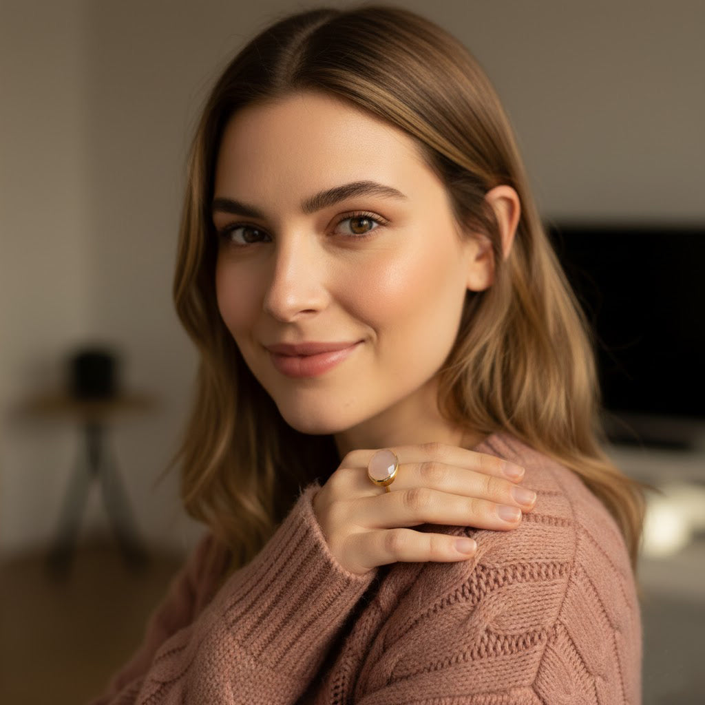 Delicate, feminine, and effortlessly modern — this oval pink chalcedony ring features a softly faceted blush gemstone set in a smooth bezel frame. Designed for stacking or wearing solo, this ring adds a subtle pop of romantic color to any look.