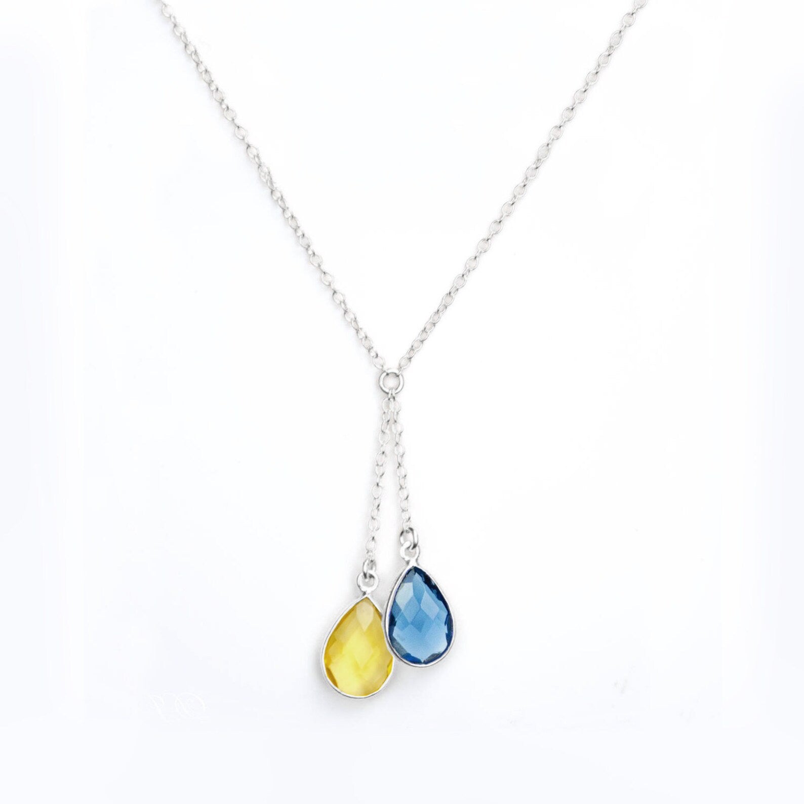 SHOW YOUR SUPPORT TO UKRAINE with our Ukrainian necklace featuring blue and yellow teardrop birthstones on a graceful lariat. Handcrafted in gold-filled, sterling silver, or rose gold, this dainty piece layers easily and carries heartfelt meaning—perfect as a gift for friends, family, or yourself. Each gemstone bezel is beautifully faceted for shimmer and motion, creating a thoughtful keepsake that speaks of hope, solidarity, and style.