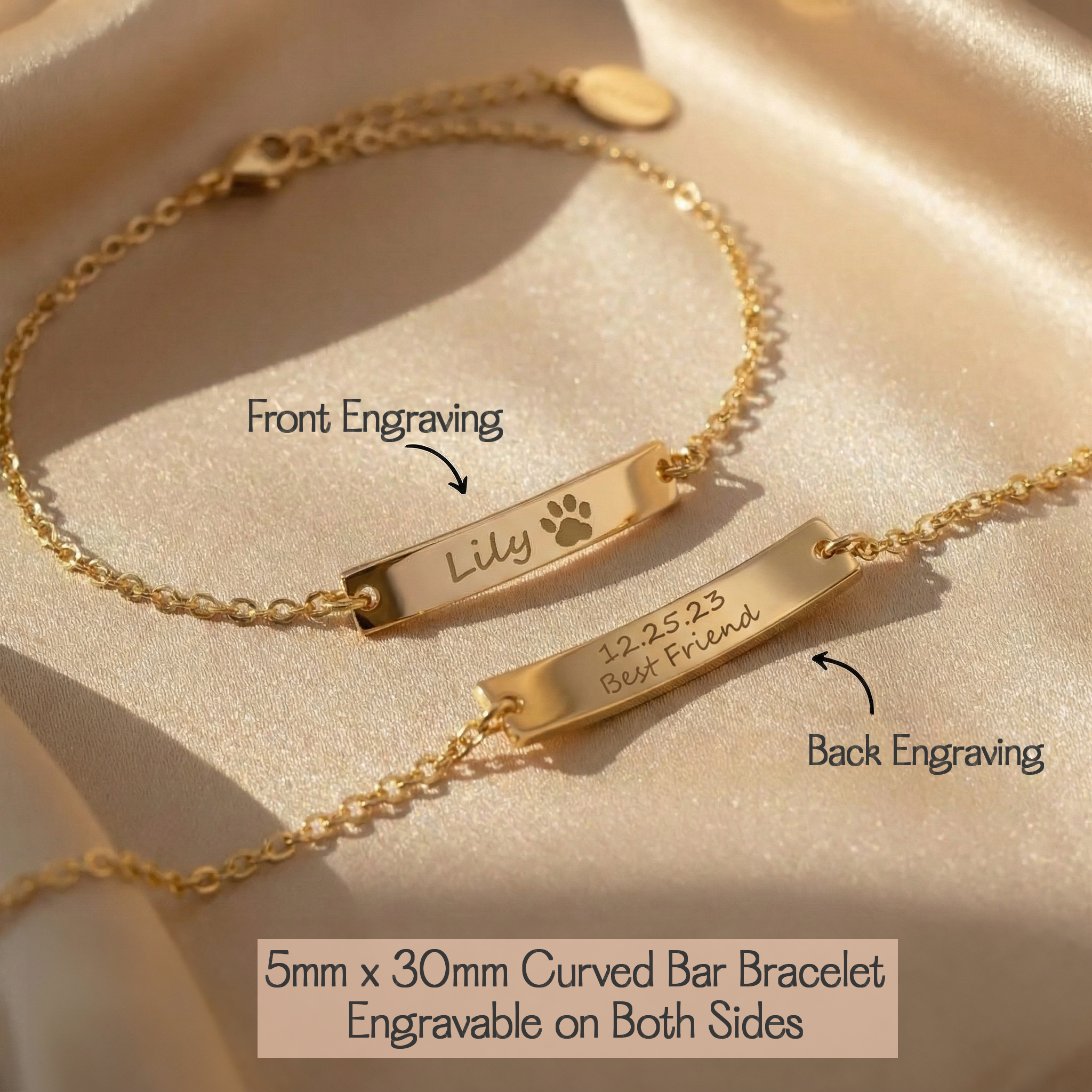A gold bar bracelet engraved with a dog's name with a small paw print. The bracelet sits on a beige silk background.