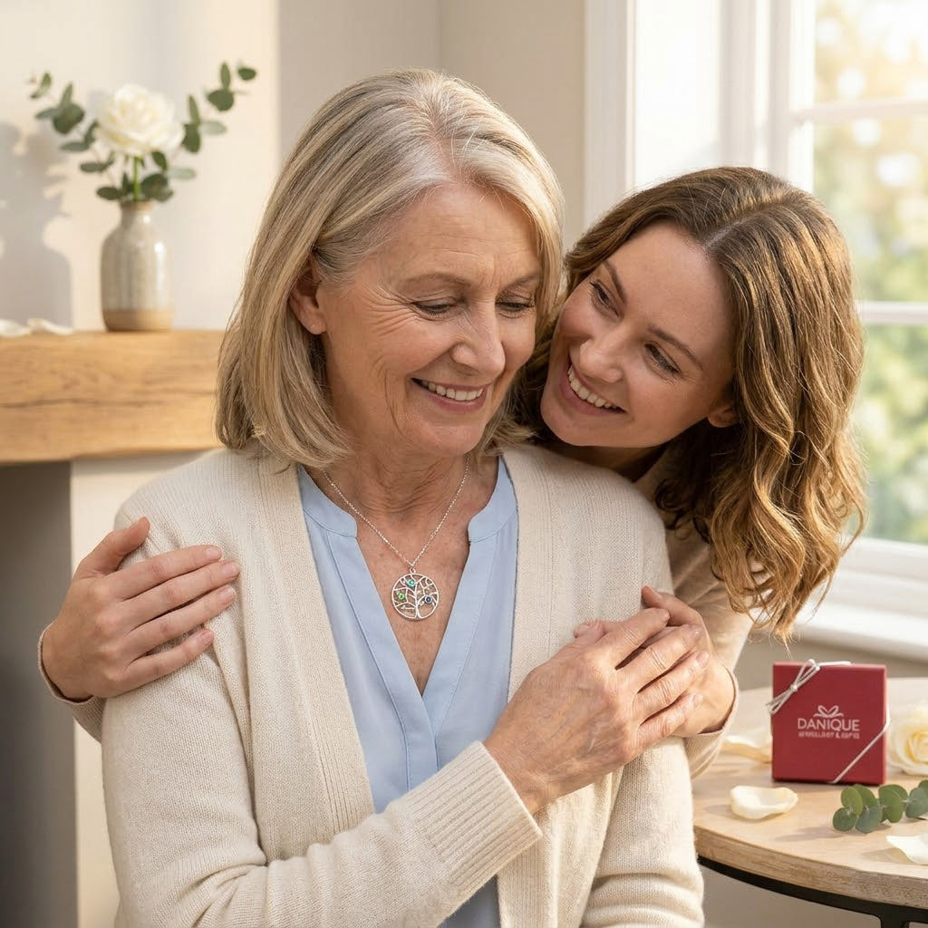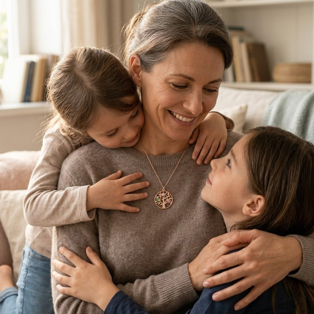 Personalized mom necklace gift shown with mother and daughter, custom birthstone family tree necklace for mom, meaningful family jewelry gift, sentimental Mother’s Day necklace, tree of life pendant with birthstones, custom necklace for mom from daughter, family birthstone pendant, gift for grandma, personalized jewelry for women, heartfelt keepsake necklace celebrating children and family connection