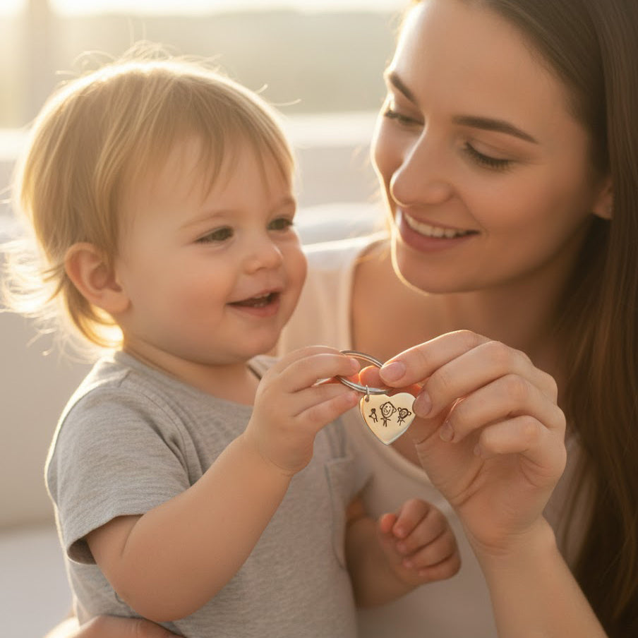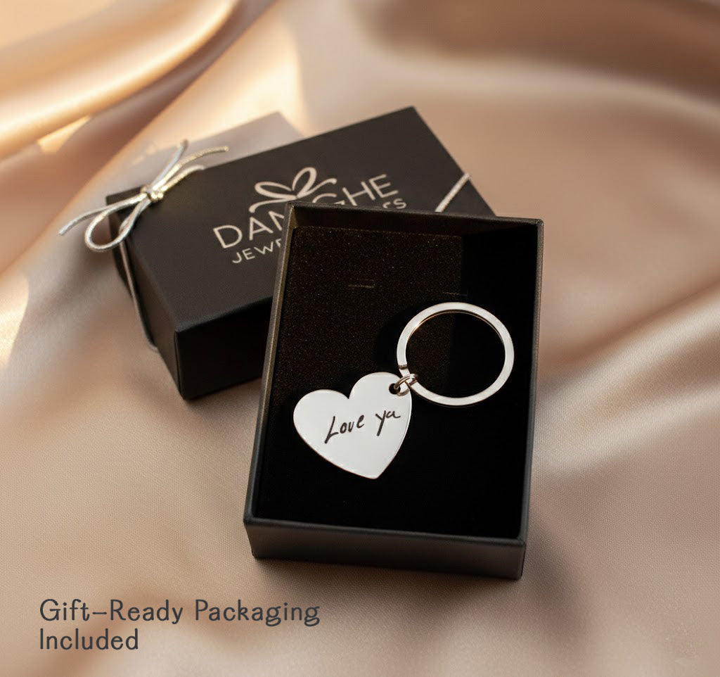 This precious keychain captures a special hand-made drawing or handwriting permanently onto a high-quality and durable zinc-alloy heart shape. Polished surface with softened edges and a spring style stainless steel keyring ensure that this will make for a beloved and meaningful gift for anyone: mom, dad, grandpa, grandma, co-workers, and friends.
