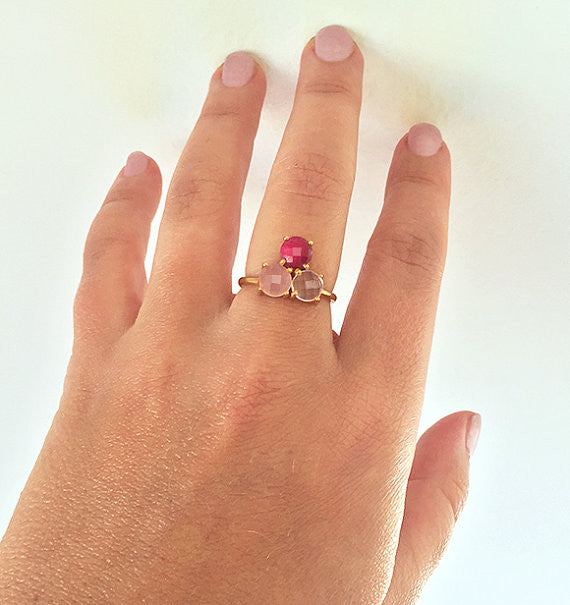 This unique custom mother's ring features three checkerboard faceted birthstones that are carefully prong set in place in a unique pyramid shape. A clean and simple design that packs so much meaning and love into one piece! This would be a great Mother's Day gift for a mom of three children as she can have her children close to her at all times.