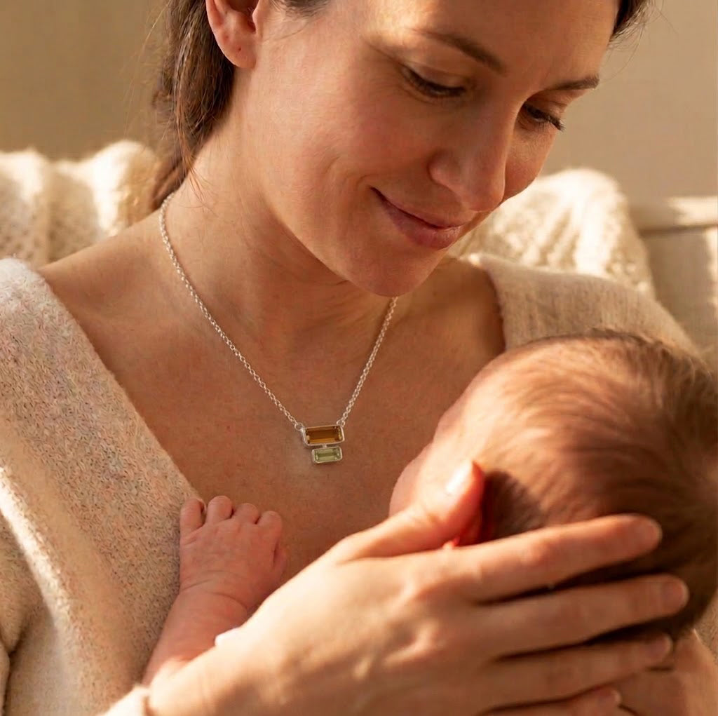 Celebrate your story with a custom mother’s birthstone necklace designed to represent the people who matter most. This elegant piece features a larger baguette-cut birthstone for mom, paired with smaller horizontal birthstones symbolizing each child — creating a timeless and deeply personal family keepsake.