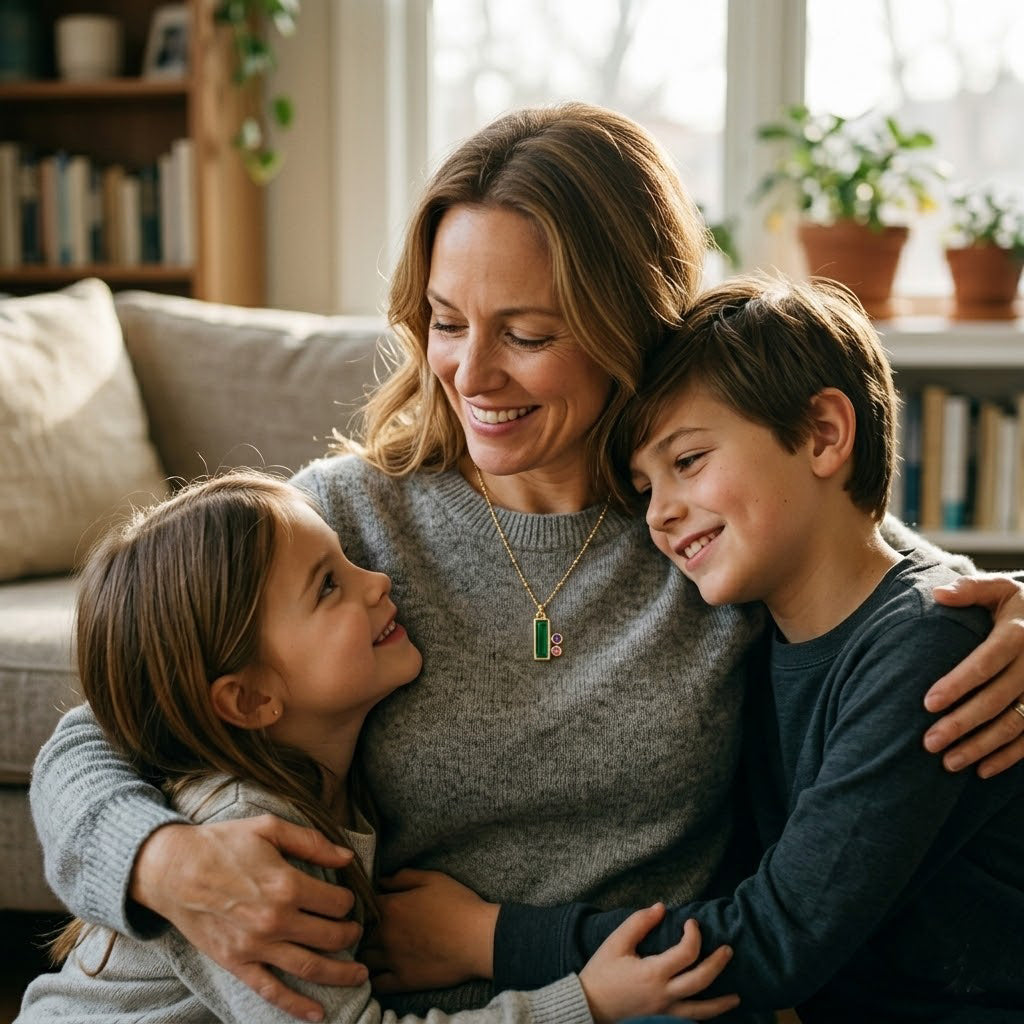 Celebrate your story with a custom mother’s birthstone necklace designed to represent the people who matter most. This elegant piece features a larger vertical baguette-cut birthstone for mom, paired with smaller birthstones symbolizing each child — creating a timeless and deeply personal family keepsake.