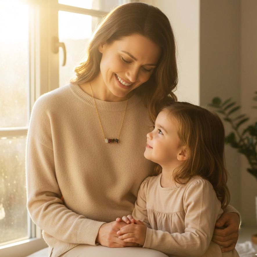 Mother wearing custom birthstone necklace while sitting with child, symbolizing family love and connection. Personalized mom necklace featuring children’s birthstones, designed as an emotional gift for mothers and family keepsakes.