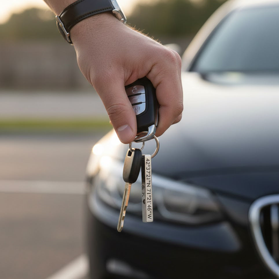 MARK LIFE'S MOMENTS with our personalized keychain—a polished 3D bar engraved on up to four sides with names, dates, or GPS coordinates. Crafted in durable stainless steel finishes (silver, gold, rose, black, rainbow), this modern keyring is a meaningful everyday carry for him or her. Gift-ready and made in the USA, it’s perfect for anniversaries, new drivers, long-distance love, graduates, dads, and groomsmen.