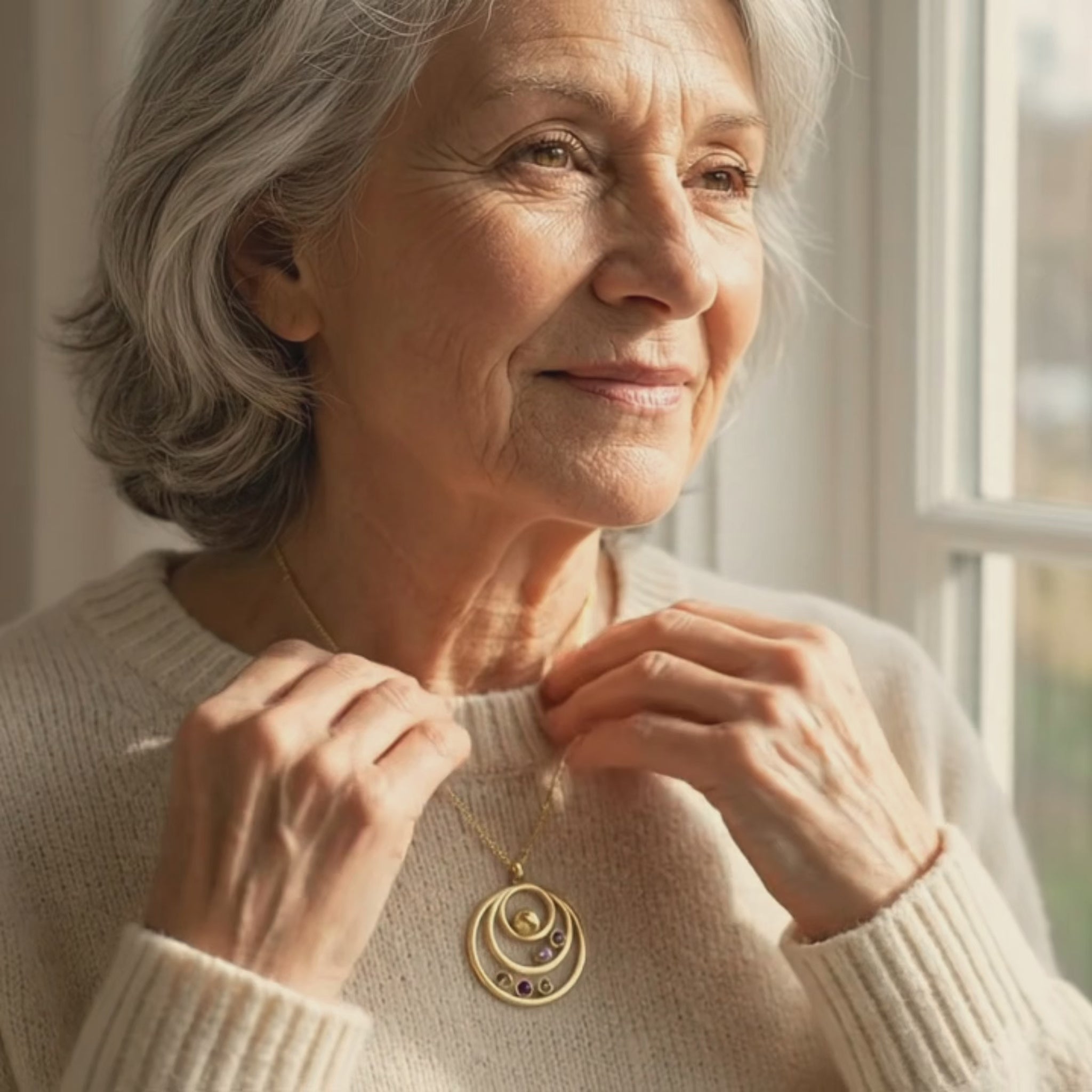 Mom wearing personalized orbit birthstone necklace representing kids and grandkids, custom multi-birthstone family pendant gift for mother or grandmother.