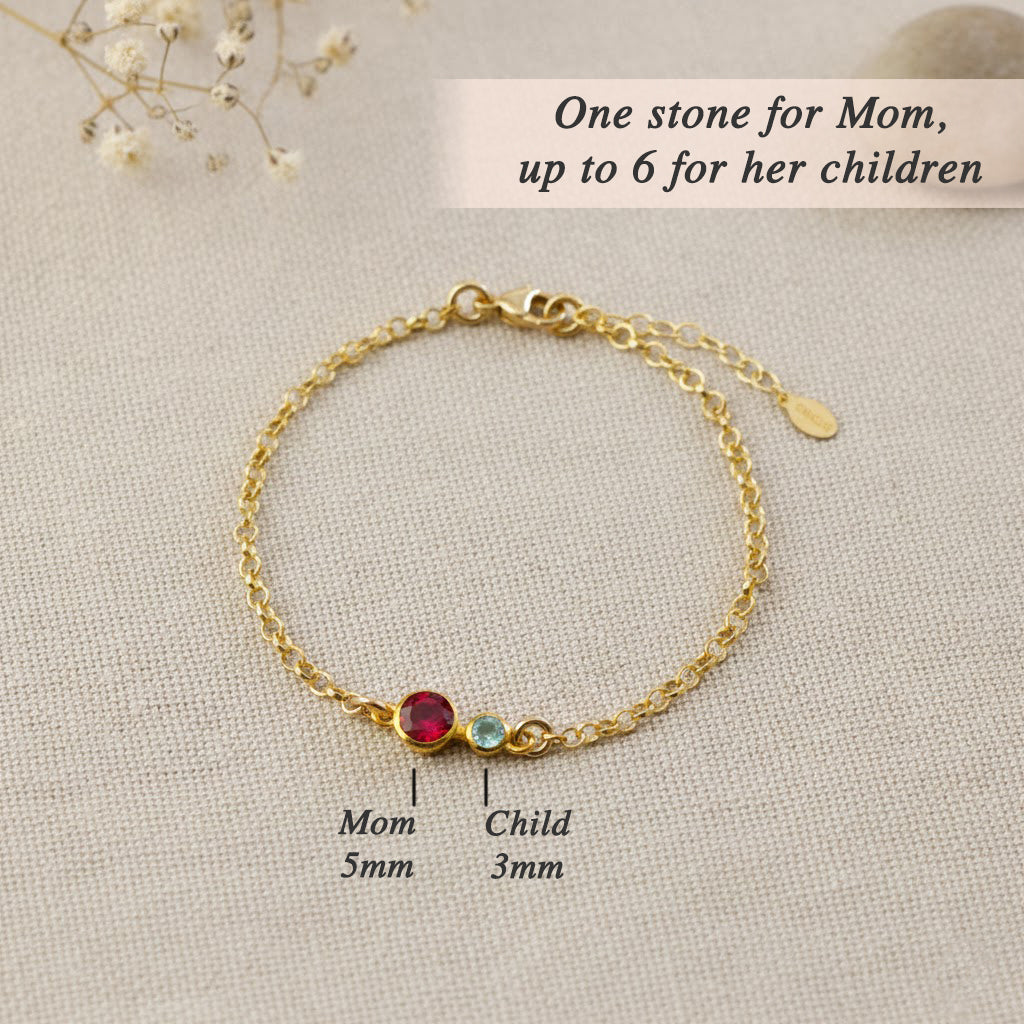 Designed to celebrate motherhood, this personalized birthstone bracelet pairs a bold 5mm mom gemstone with smaller 3mm child stones in a sleek bezel setting, making it a meaningful gift for moms, grandmas, and new mothers.