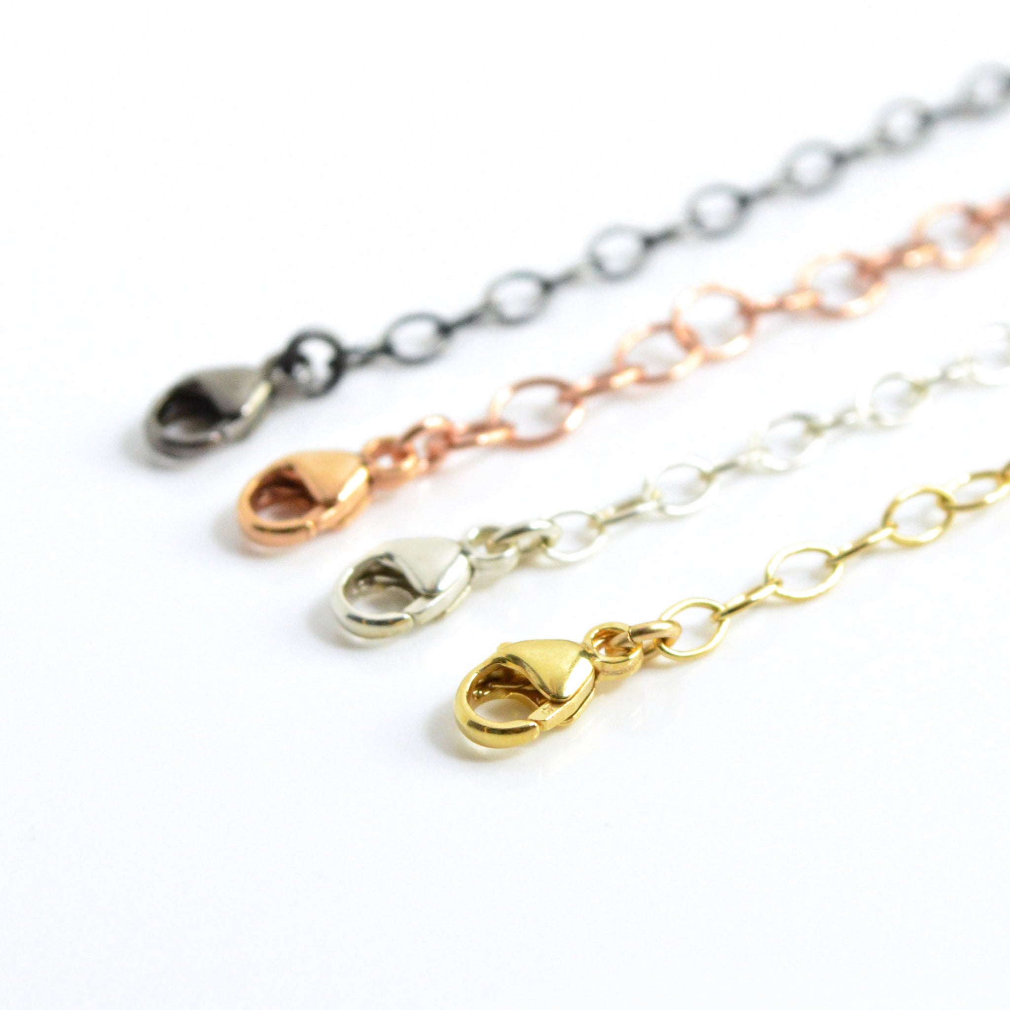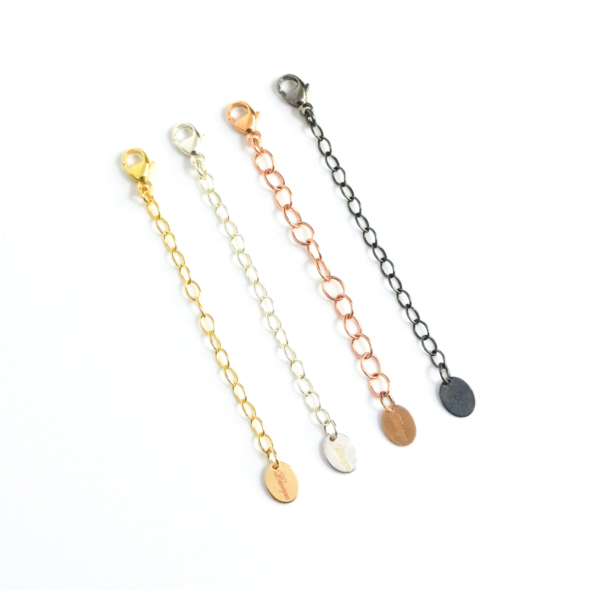 Four necklace extender chains in sterling silver, gold, rose gold, and oxidized finishes with flat disc details. Adjustable length between 1–6 inches for the perfect jewelry fit. Great for extending short necklaces, chokers, or bracelets. Handmade jewelry accessory gift for women, moms, and friends.