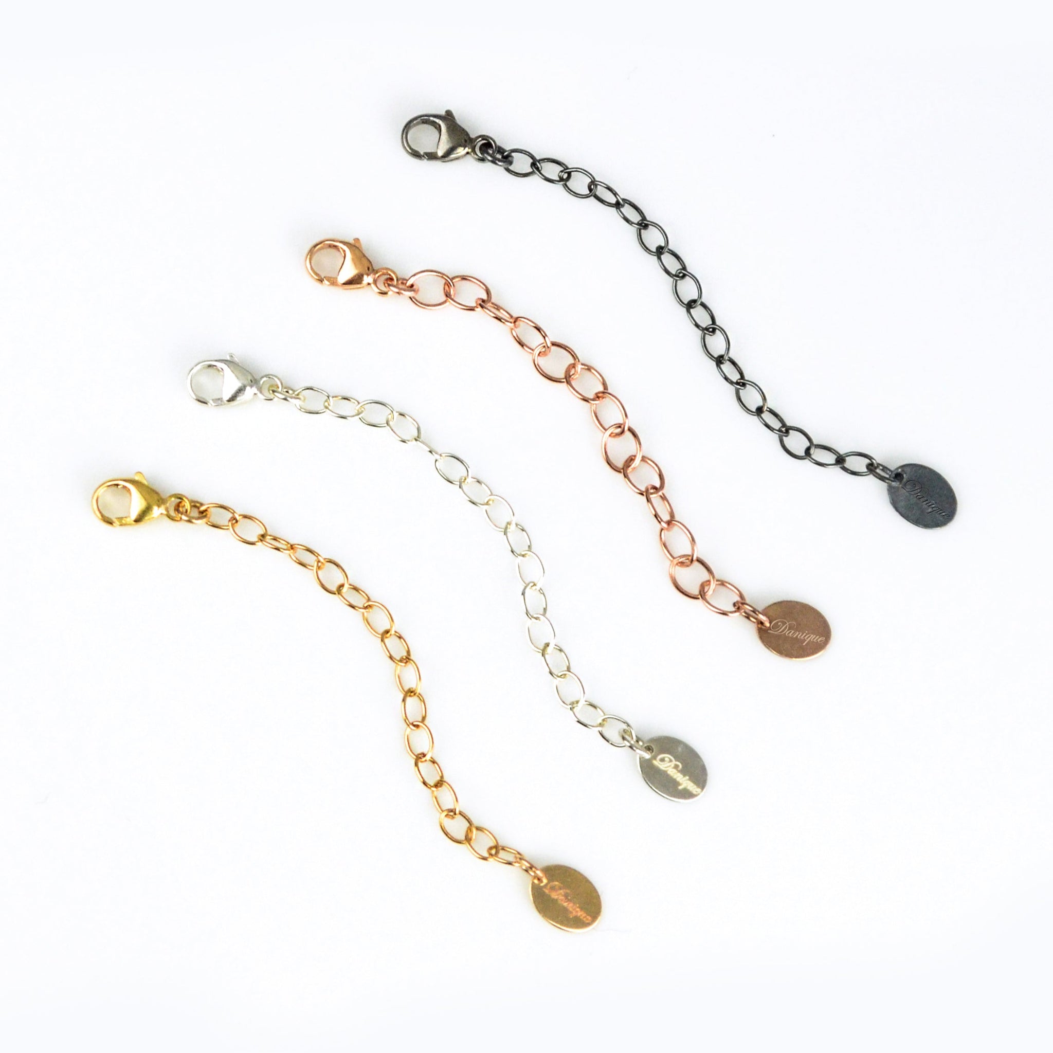 Set of necklace extenders in gold, silver, and rose gold with lobster clasps, ideal for layering or adjusting necklace length. Adjustable chain extension adds versatility to jewelry collection, ensuring a comfortable fit for every outfit. Jewelry accessory gift idea for birthdays, bridesmaids, or everyday wear.