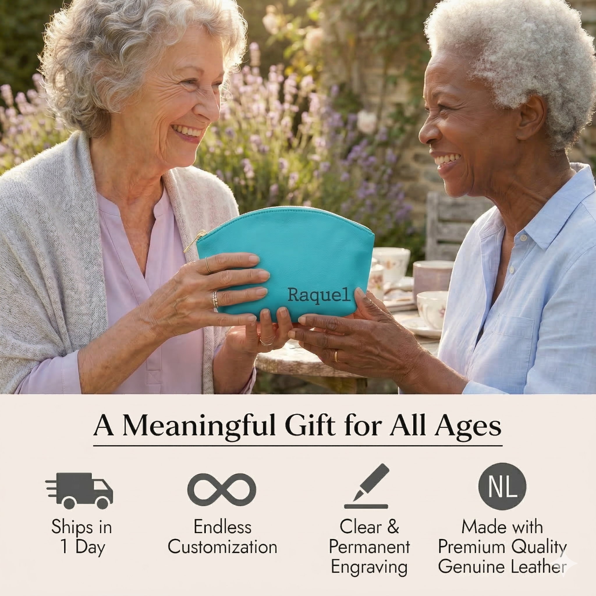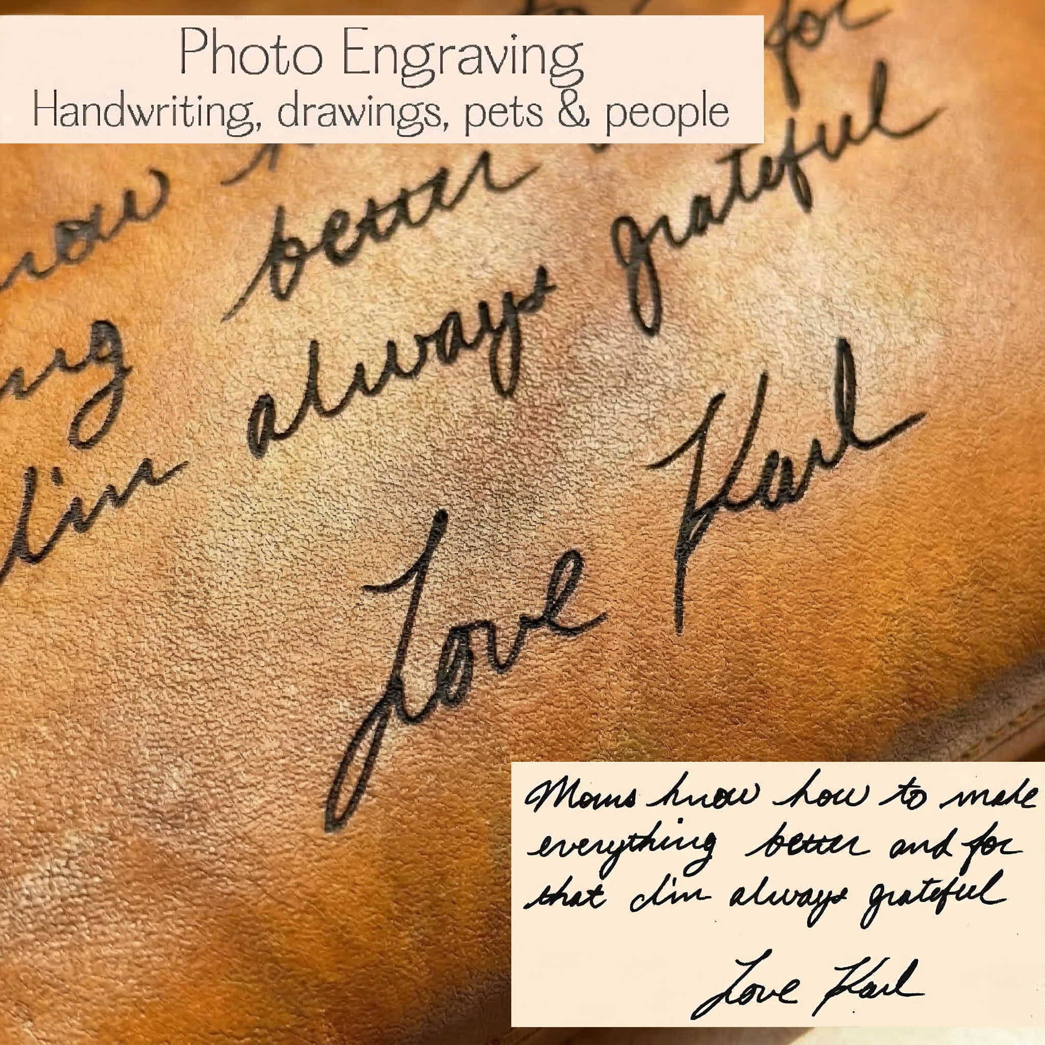A: Select leather color, engraving style, provide your text, and include details in the “Notes” section at checkout.